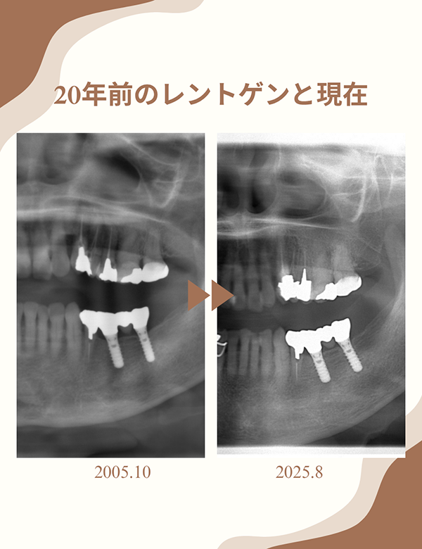 20年間でインプラント周囲の骨吸収もほとんどなく、「何でも咬めるよ!」と、いつも笑顔で喜んでくださいます😊
